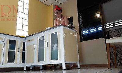 Nudist housekeeper Regina Noir cooking at the kitchen. Naked maid makes dumplings. Bare cooks. bra Trio